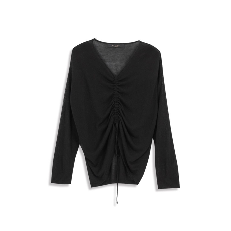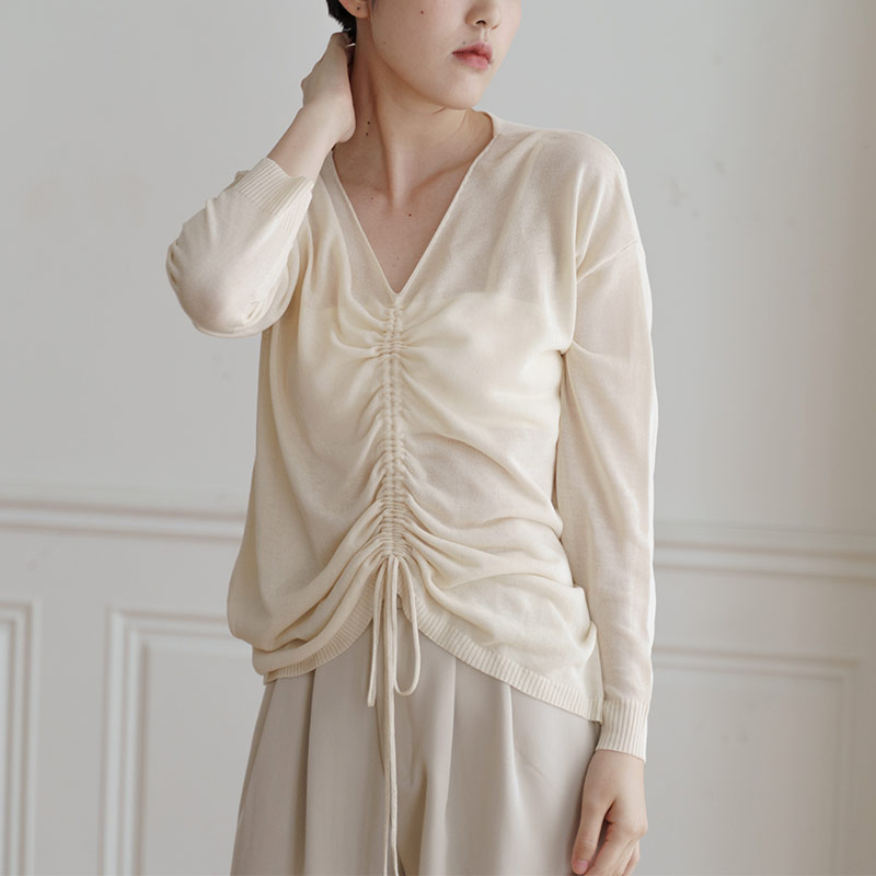 V-neck plain drawstring design micro-transparent tops sold in two colors