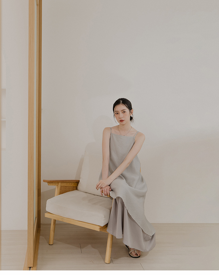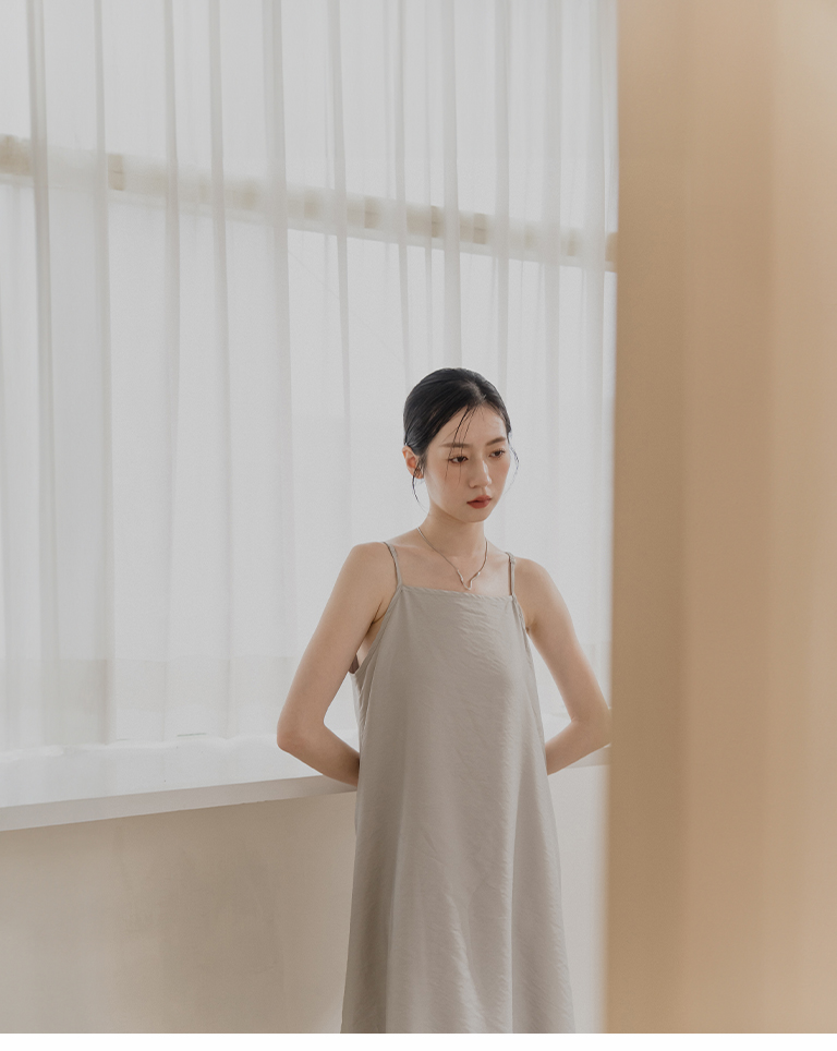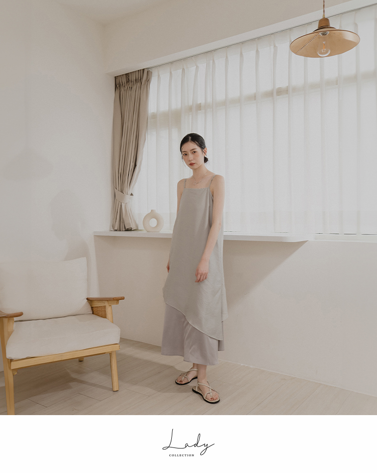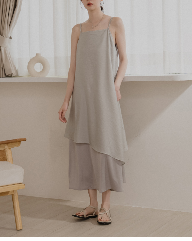 光澤緞面雙層細肩長洋裝-灰