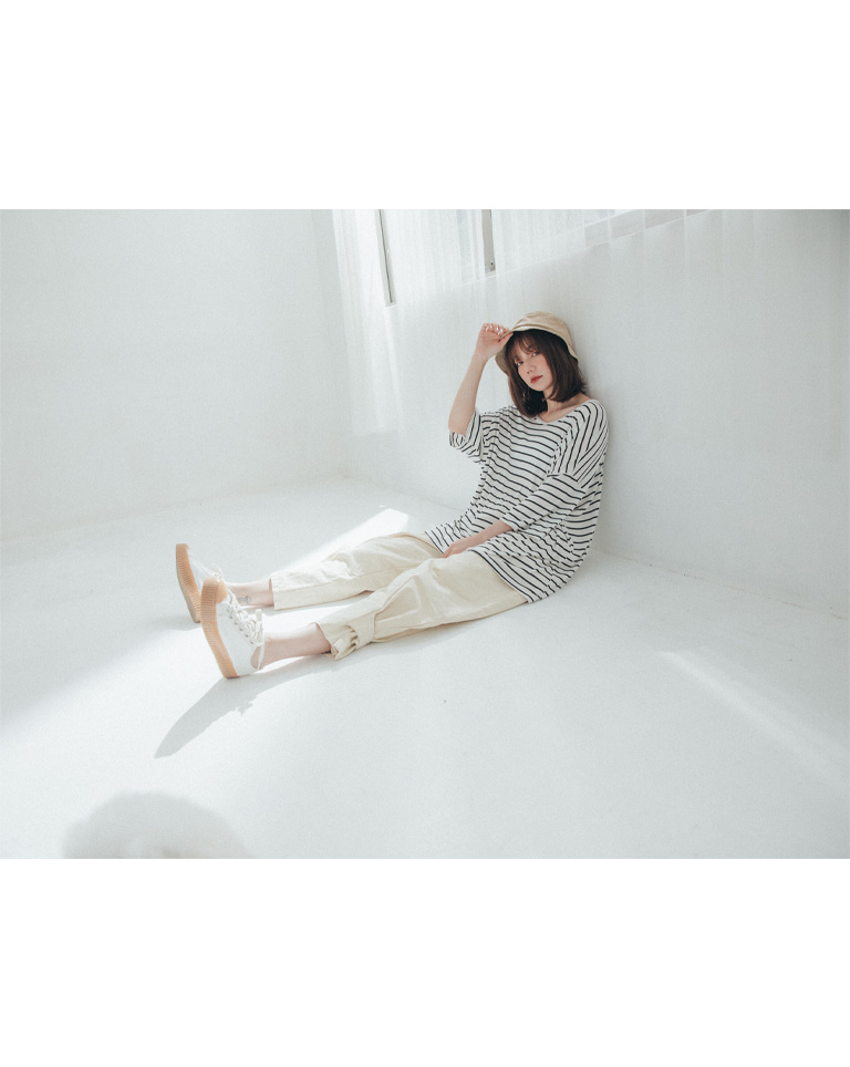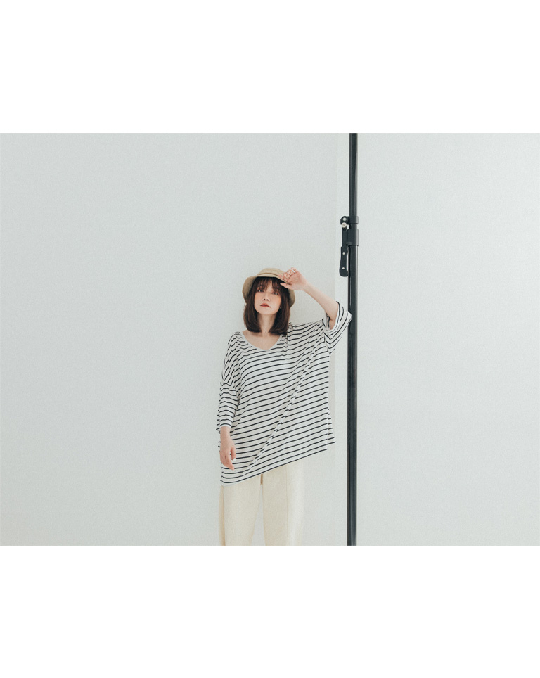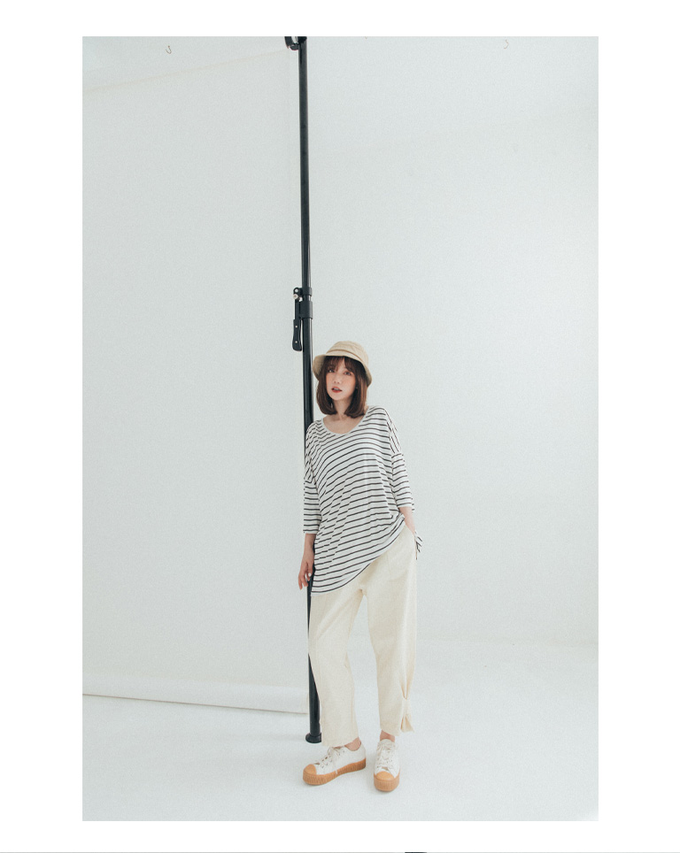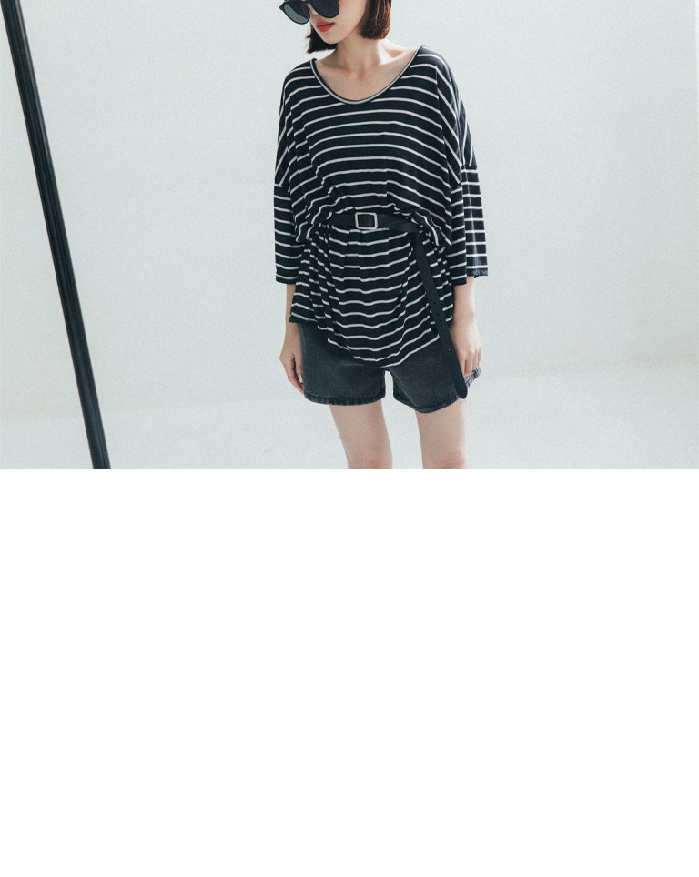 雙U領條紋落肩寬鬆上衣 三色售
