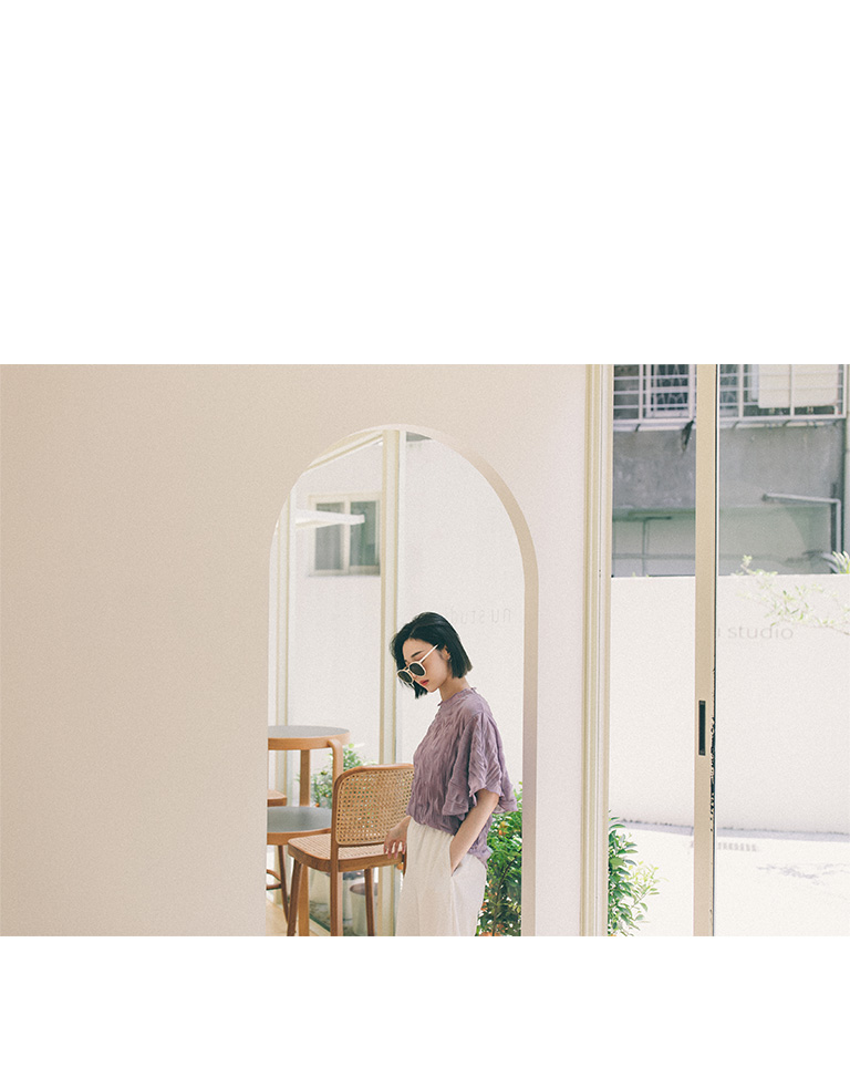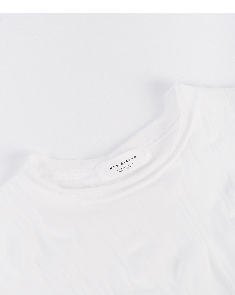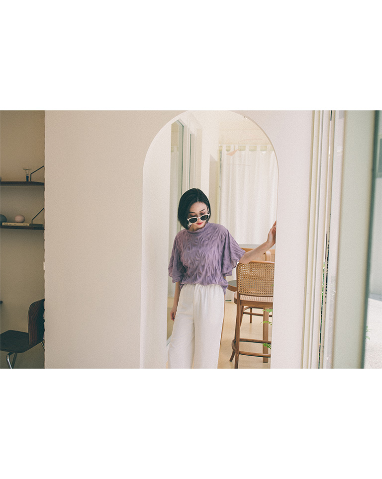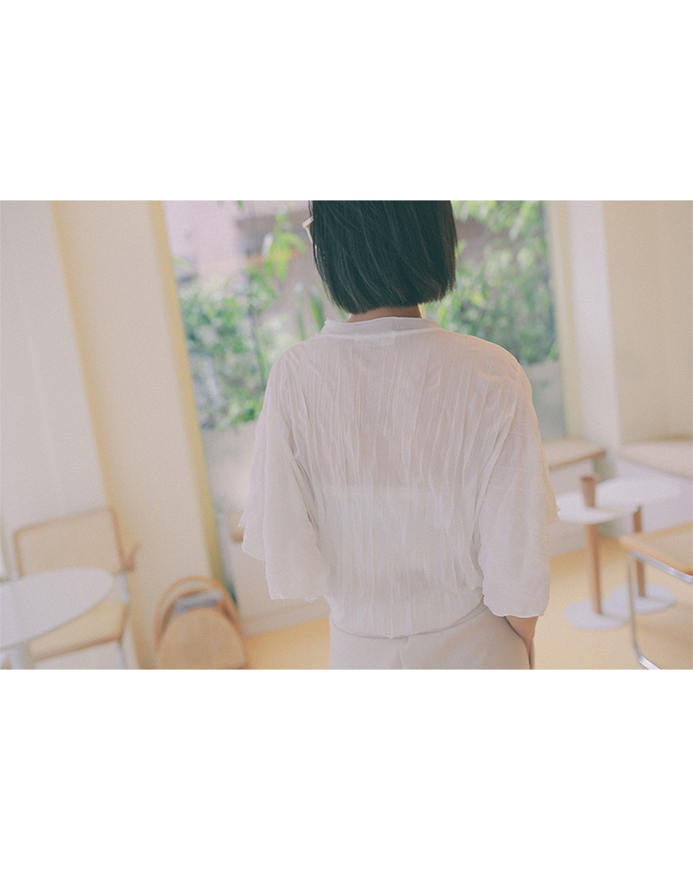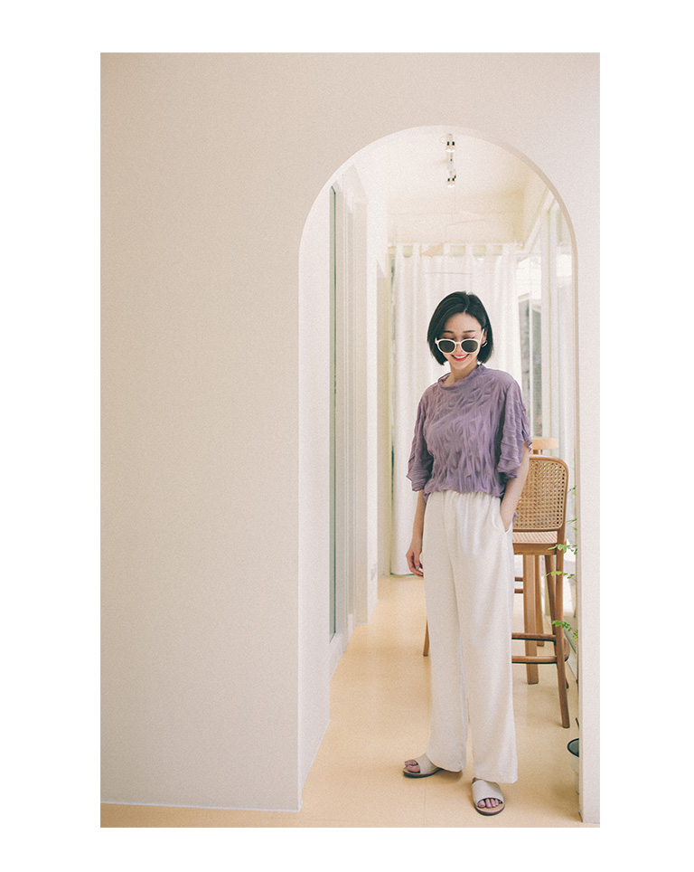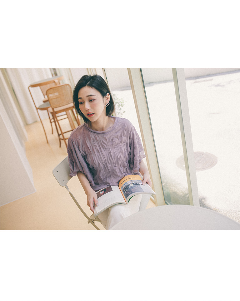 純色皺皺造型寬袖微透上衣