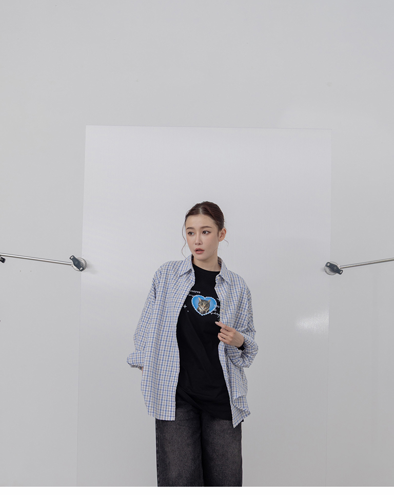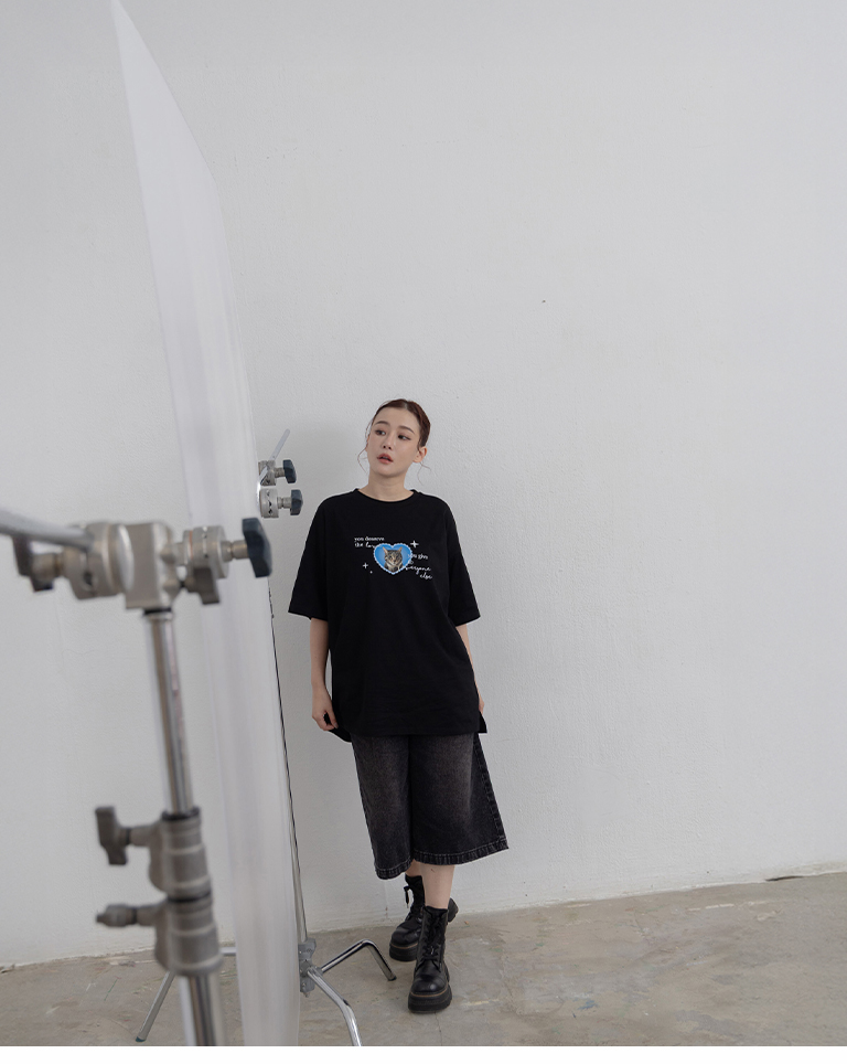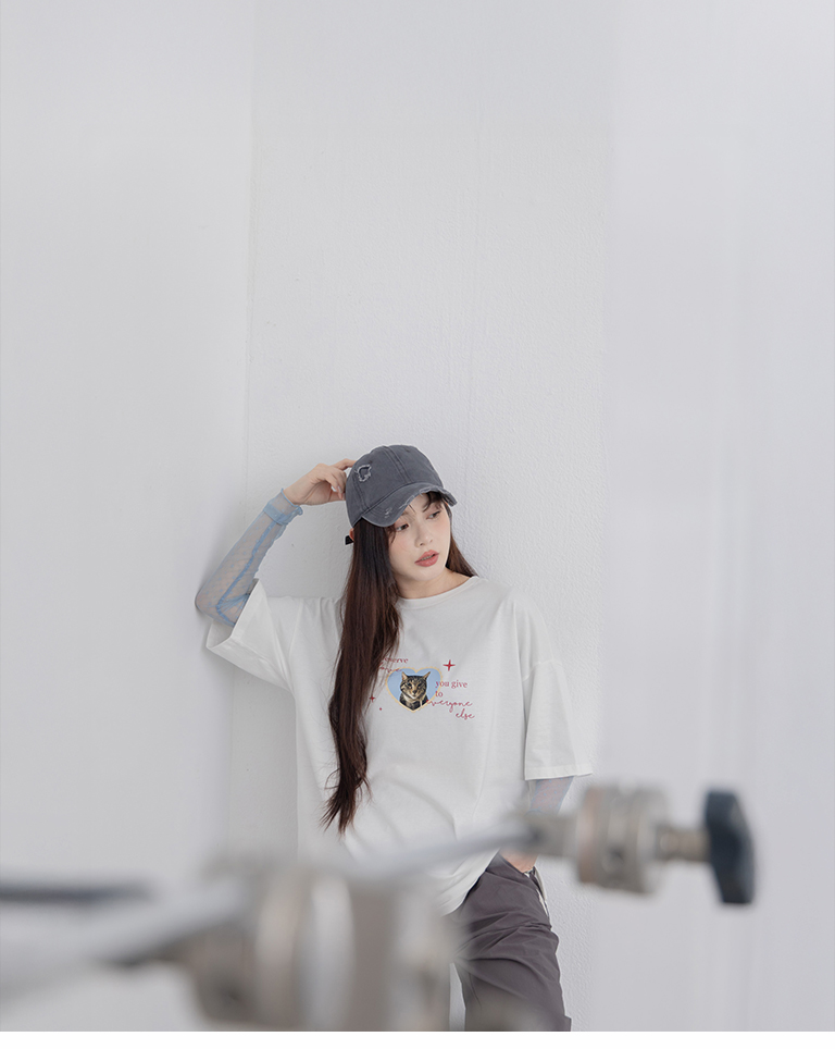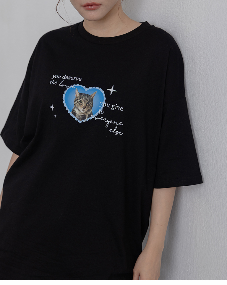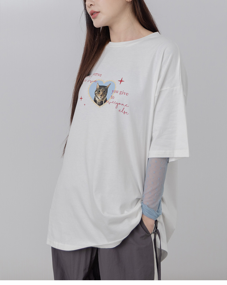愛心貓咪印圖寬版短袖上衣 兩色售
