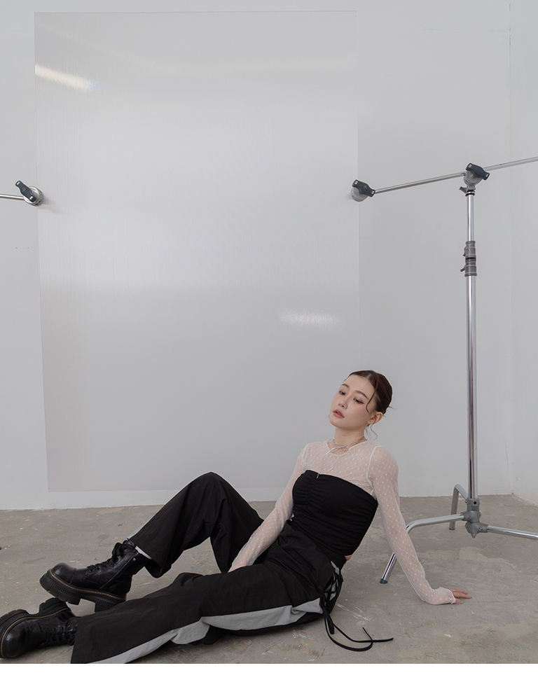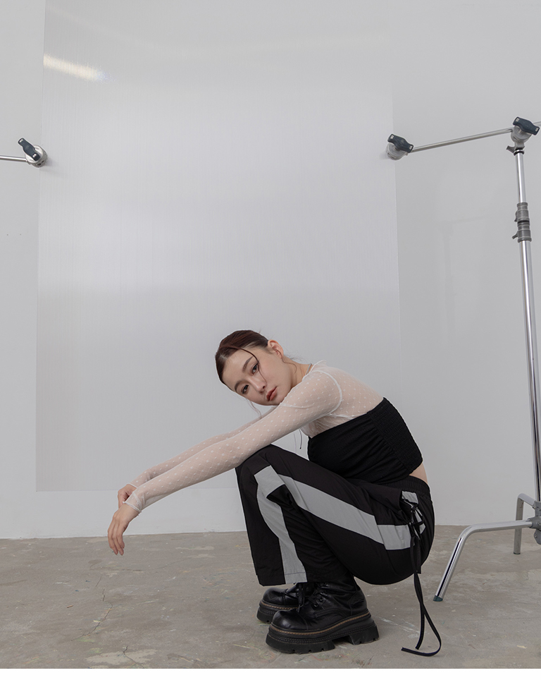 側撞色拼接和交叉綁帶 為整體造型增添亮點