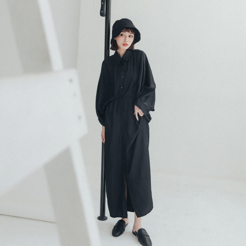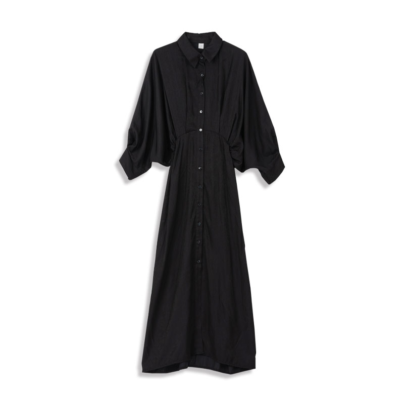 大拋袖設計絨面黑色襯衫長洋裝