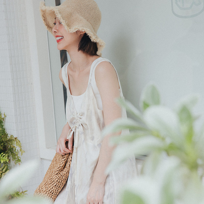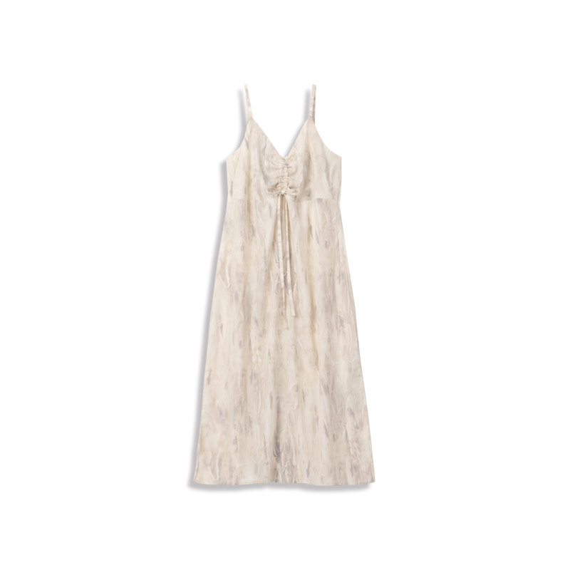 水墨印花抓皺綁帶細肩洋裝