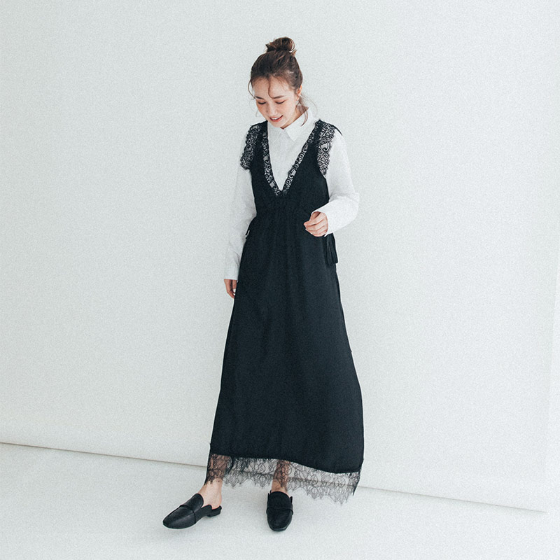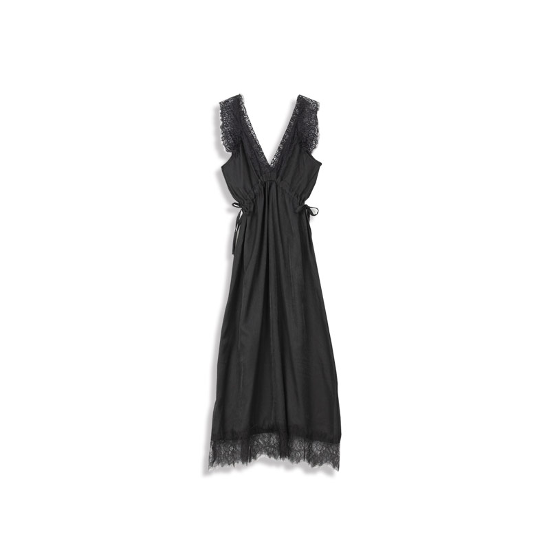 質感V領蕾絲黑色長洋裝
