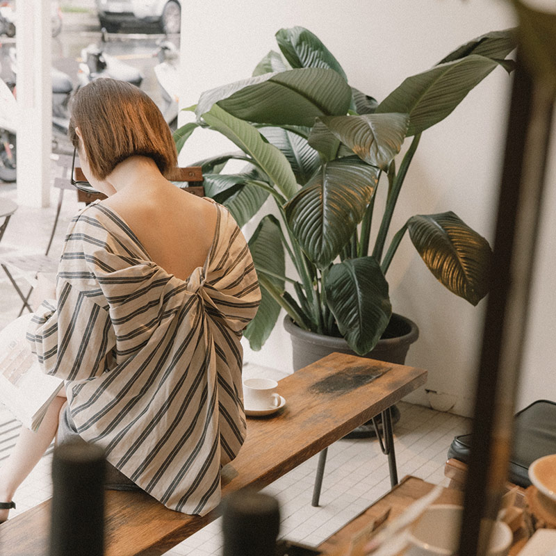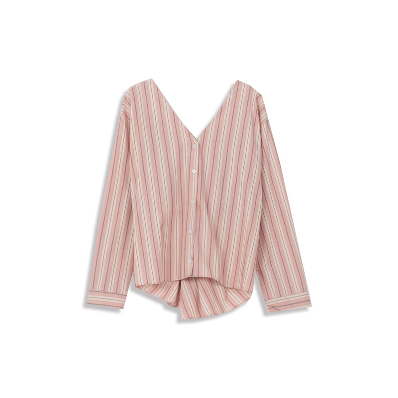 配色直條紋V領後扭結造型上衣 兩色售