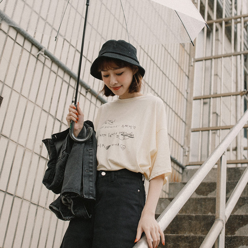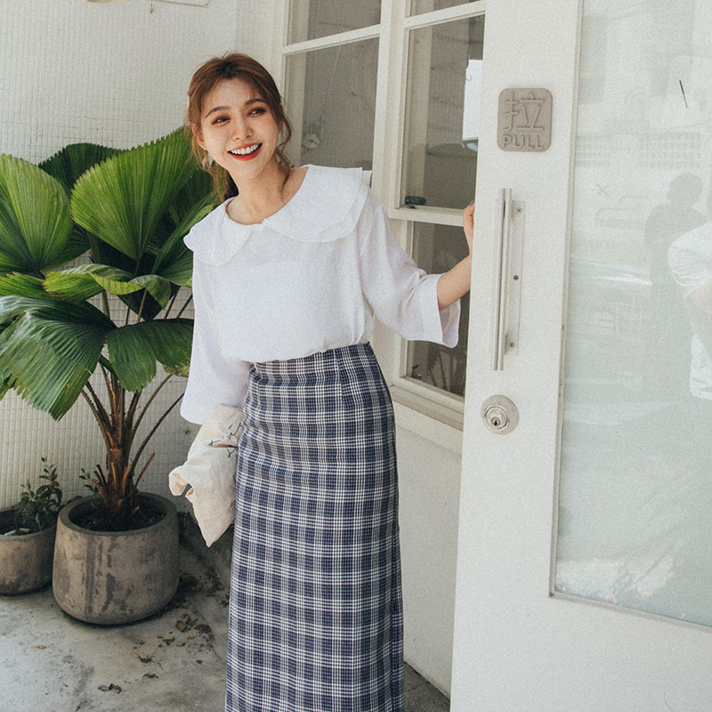 圓領拼接黑白格紋傘擺寬鬆上衣